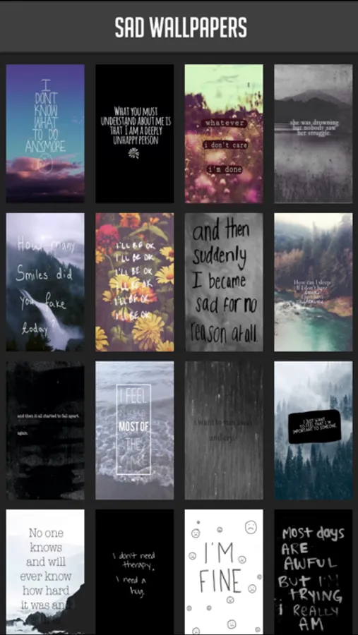 When you're feeling depressed and sad, sometimes is just makes it worse to fake a smile. It's okay to be yourself and let the world see that you're not perfect. While the wallpapers in this app reflect your sadness and hurting, they also serve another purpose; they remind you that you are not alone in your suffering. There are many other souls out there who know the pain and loneliness of depression or a broken heart. Take comfort in the refreshing honesty of these heart-wrenching wallpapers. Each wallpaper in this app features a beautiful or meaningful background paired with a quote about struggling against your own mind and emotions.