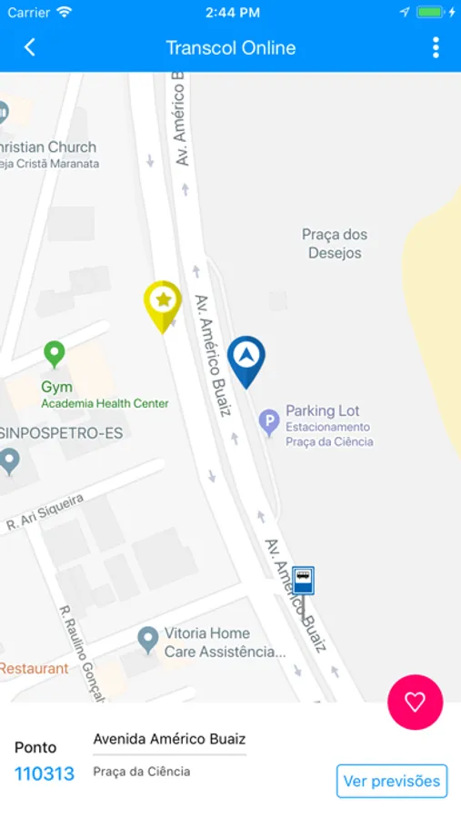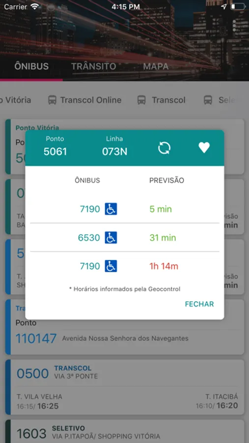 Previsões de chegada no ponto: Transcol Online e Ponto Vitória (também chamado de Verdinho ou Ônibus Vitória).