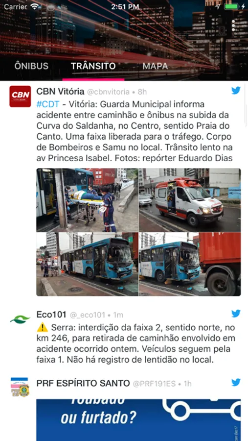 • Fique por dentro das notícias mais recentes do trânsito na Região Metropolitana de Vitória com informações da CBN Vitória, ECO101, Polícia Rodoviária Federal do Espírito Santo, RodoSol, VixNoTransito e muitas outras;