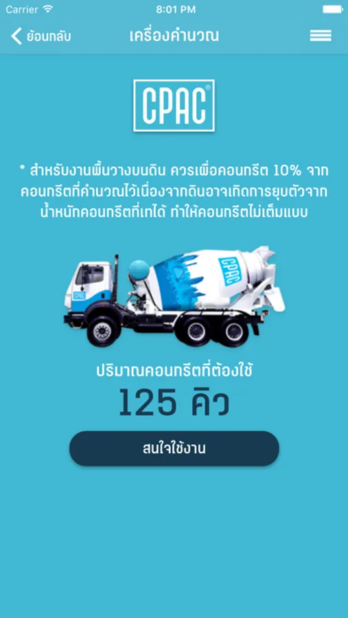 นอกจากนี้ยังมี ตัวช่วยในการคำนวนคอนกรีต เรื่องน่ารู้เกี่ยวกับงานคอนกรีต แนะนำสินค้าและบริการของซีแพค และข่าวสารที่น่าสนใจ ใช้สะดวก ครบครัน ในแอพพลิเคชั่นเดียว