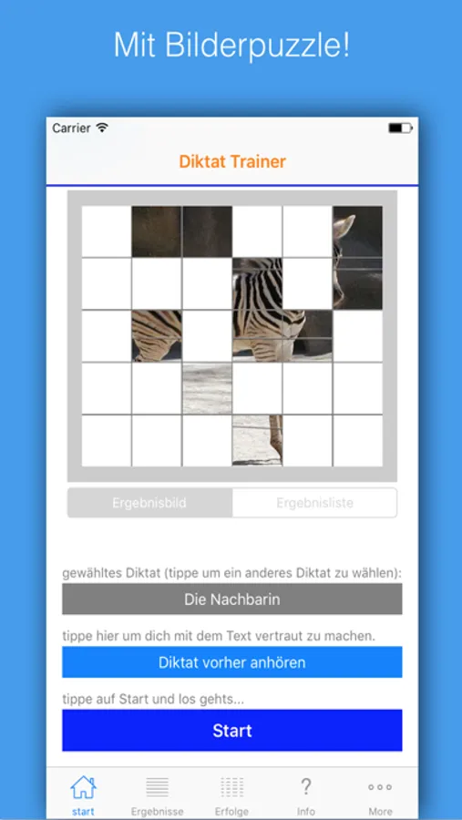 Motivation und Anreiz ist für einen erfolgreichen Lernprozess extrem wichtig. Deshalb wird jede Übung bewertet und es füllt sich - in Abhängigkeit des Erfolges - ein Bilderpuzzle!