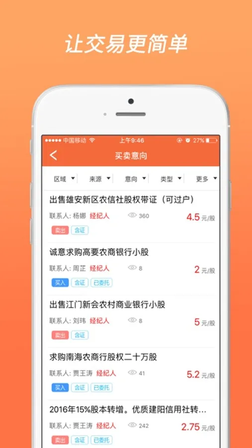 股驿台是国内首家专注于未上市银行的股权信息平台,为农信社、农商行、城商行、村镇银行的股权交易提供信息和咨询服务。以线下驻点线上撮合形式,由在线客服为股权交易双方提供一对一的专业服务。通过互联网,投资者可在“股驿台”随时了解未上市银行最新股权买卖意向、股权交易、银行经营情况、未来上市情况等信息,交易双方也可直接联系沟通,实现未上市银行股权的流通。