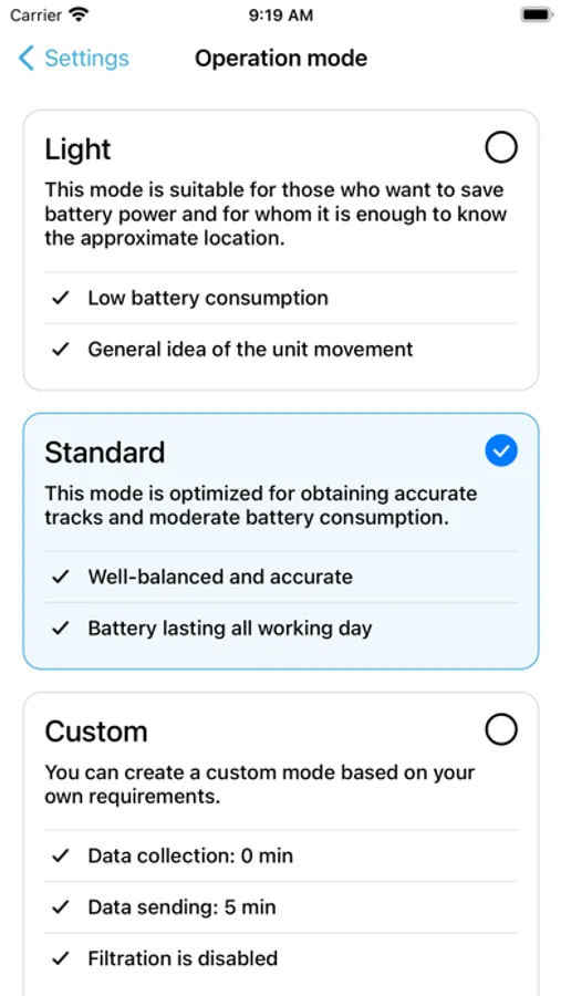 The application supports choosing a user mode from preset ones or creating your own with settings depending on the goals of monitoring. A wide range of settings available allows receiving accurate data while reducing traffic and battery consumption.