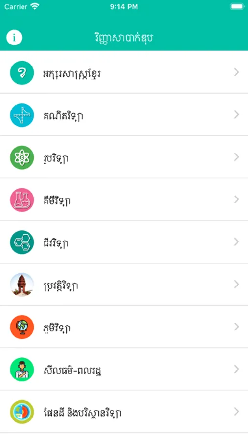 Khmer literature, Mathematics, Physics, Chemistry, Biology, History, Geography, and English.