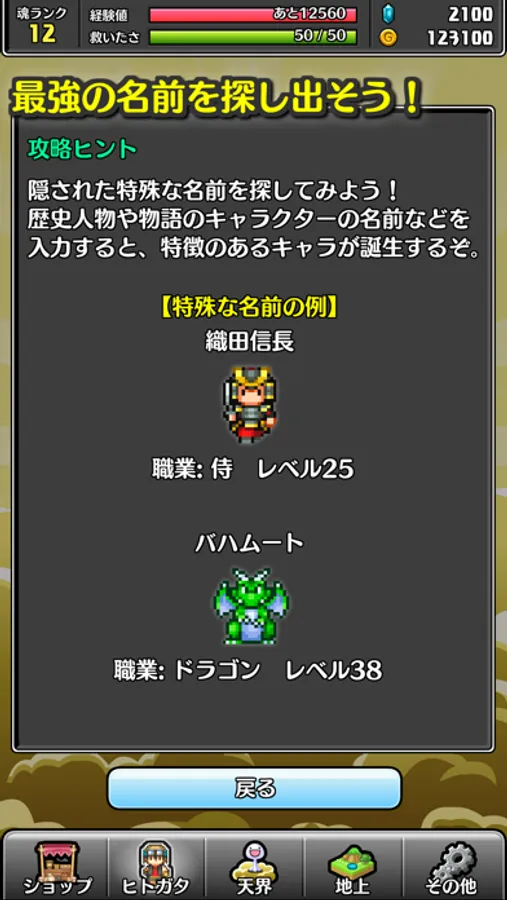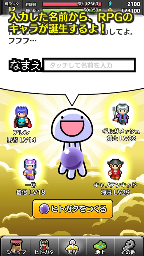 入力した名前によって、能力値やジョブが異なるキャラが創り出されるぞ。どんなキャラになるかは、名前次第だ。最強の名前を見つけよう!