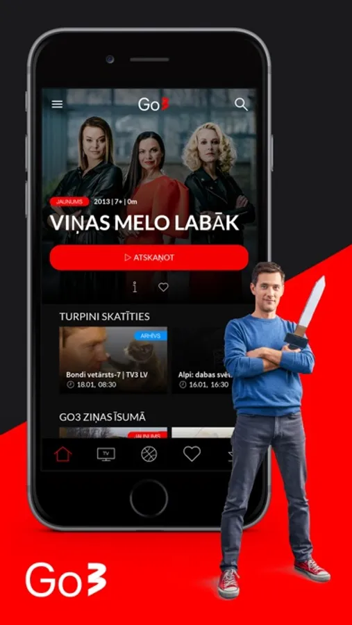 Go3 Tu atradīsi savus iemīļotākos TV kanālus, seriālus, animācijas filmiņas un pasaules klases sporta tiešraides, ko varēsi skatīties, kur un kad vēlies - mājās vai esot ceļā.