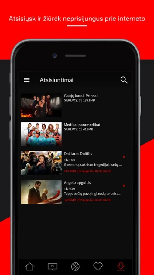 - Atsisiuntimo funkciją, kuri leidžia žiūrėti neprisijungus prie interneto