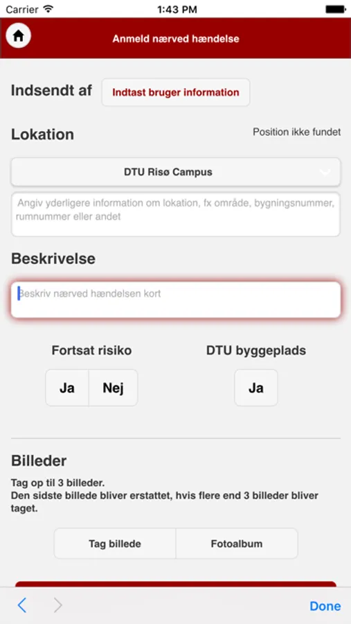 • At angive hændelsens sted, med udgangspunkt i den position telefonens GPS finder