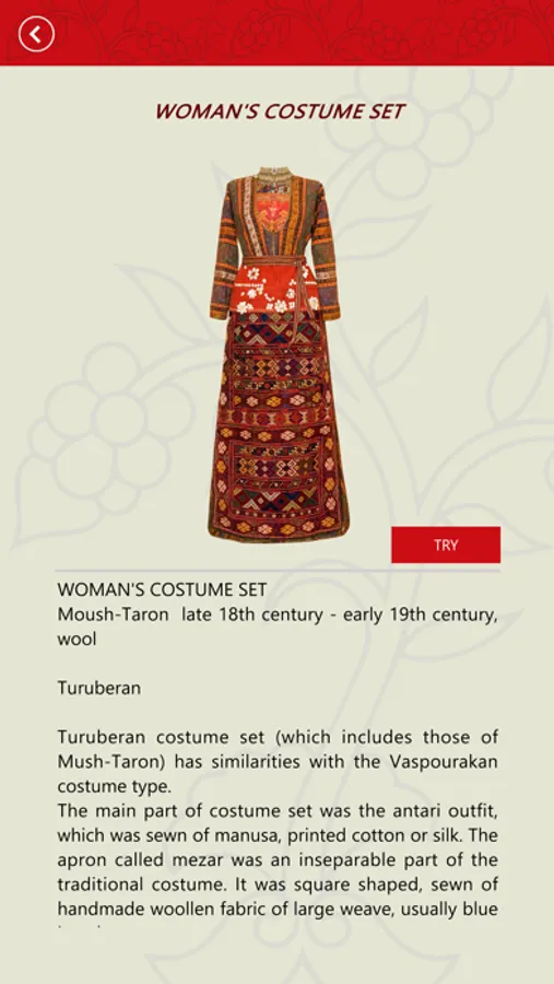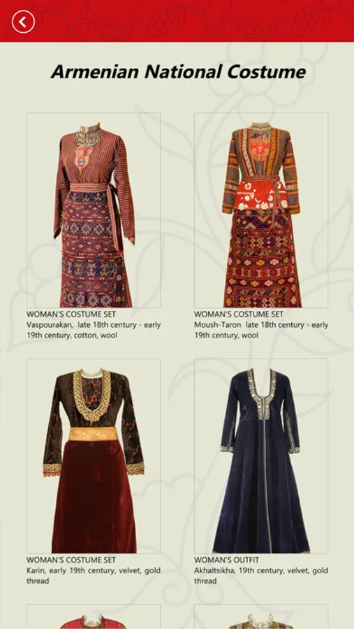 Welcome to the "Armenian National Costume" app. "Armenian National Costume" lets you take a quick trip in time and space and learn about 40 types of traditional costumes, take a stylish photo of you wearing the costume of your choice and share it with your friends.