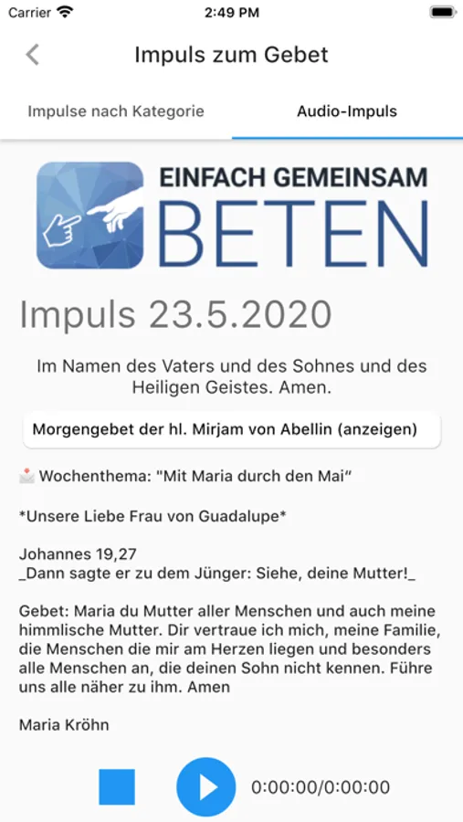 • "Gebetsanliegen": Wenn wir miteinander und füreinander beten, dann hat das Gebet eine besondere Kraft und lässt uns wachsen im Glauben und in der Liebe. In dieser App-Funktion kannst du Gebetsanliegen notieren und mit anderen teilen - und Gott danken, wenn du eine Gebetserhörung erfährst.