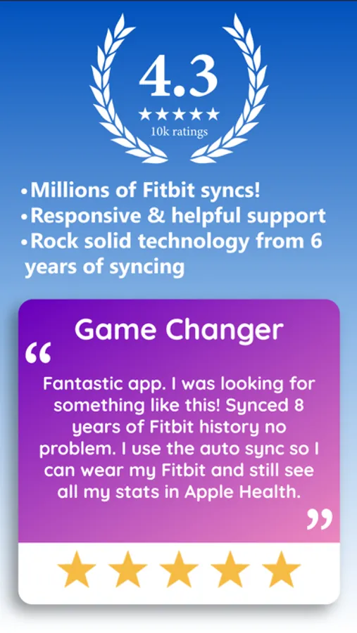Over 5,000 5 star reviews! Our rock-solid syncing technology has synced Fitbit data to Apple Health for over 100,000 people in the last 5 years