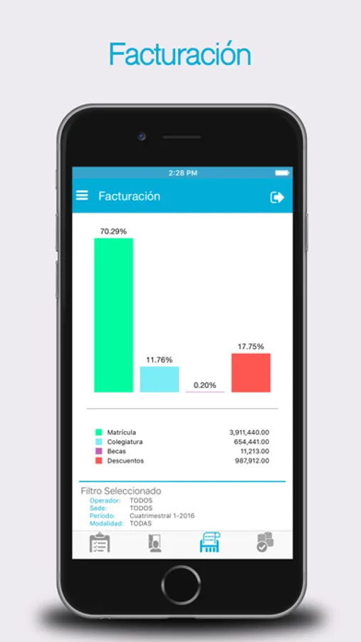 Accede a la información institucional de manera instantánea y conoce todo lo que pasa en temas como pre matrícula y matrícula de un periodo, facturación de matrícula, asignaturas, becas y descuentos, además tendrás acceso a los auxiliares de cuentas por cobrar y la deserción estudiantil; todo ilustrado con datos estadísticos en forma gráfica.