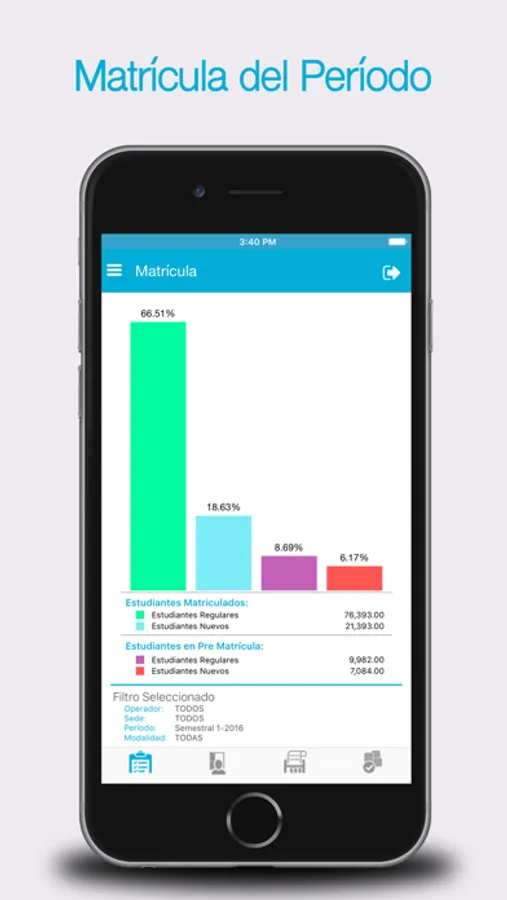 Todos pueden ser filtrados de acuerdo a permisos de los usuarios por sedes, periodos y modalidades.