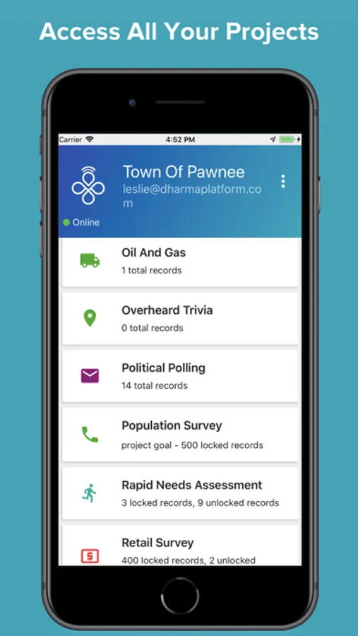 Dharma Platform allows users anywhere, anytime to collect, manage, and share field information in real time. Whether you’re tracking patients, taking polls, or testing a new product, the mobile application makes it easy to gather information, online or off. Once collected, it’s seamlessly synced to the Dharma web portal, where trends can be viewed, staff tracked, and data exported for further analysis.