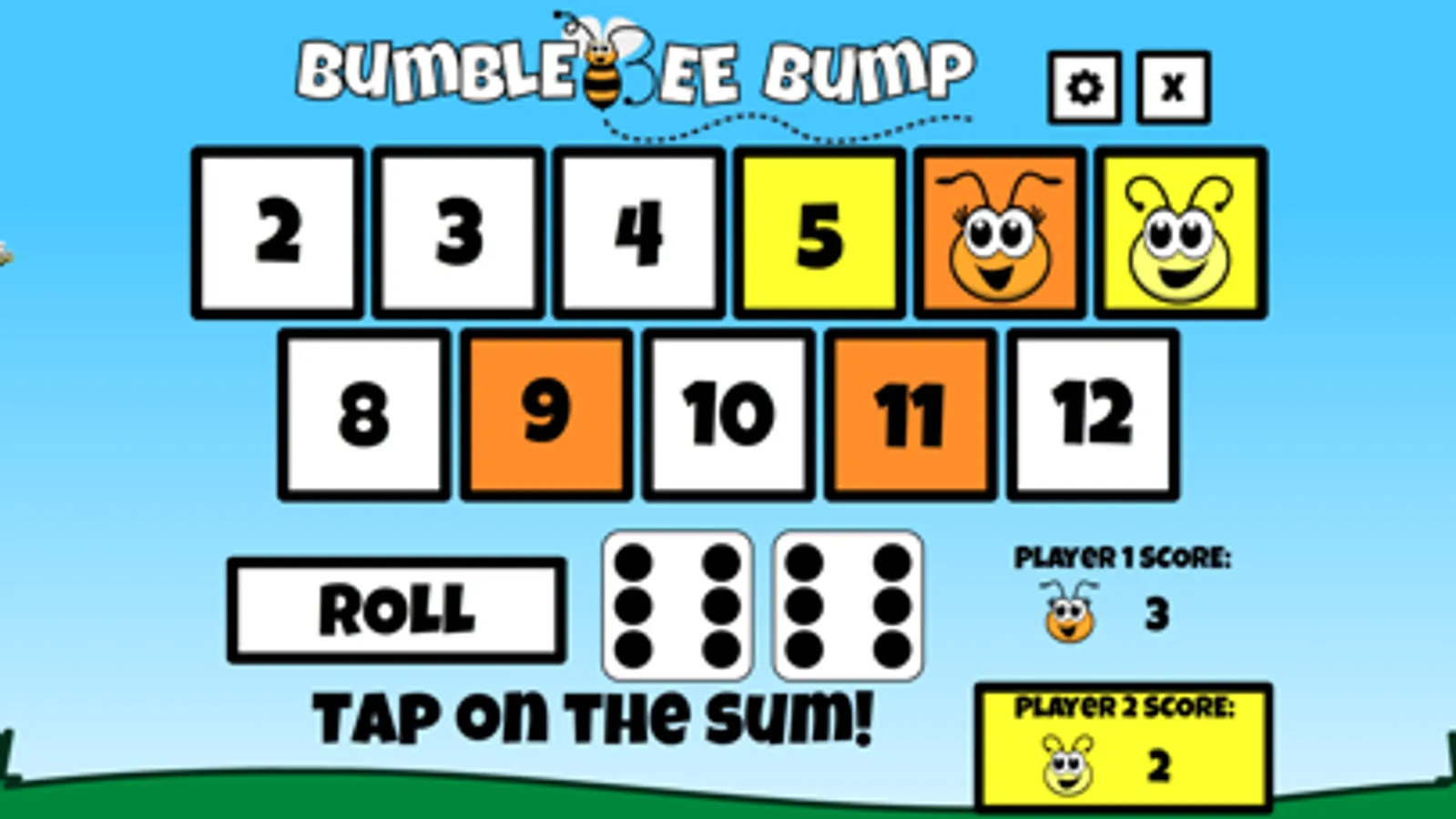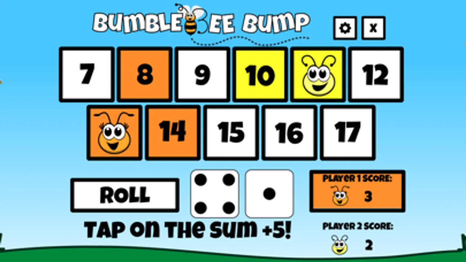 BumbleBee Bump Addition is a simple two-player game that practices basic addition skills using dice rolls. (You can also play against Haley the bumblebee in the full version!)