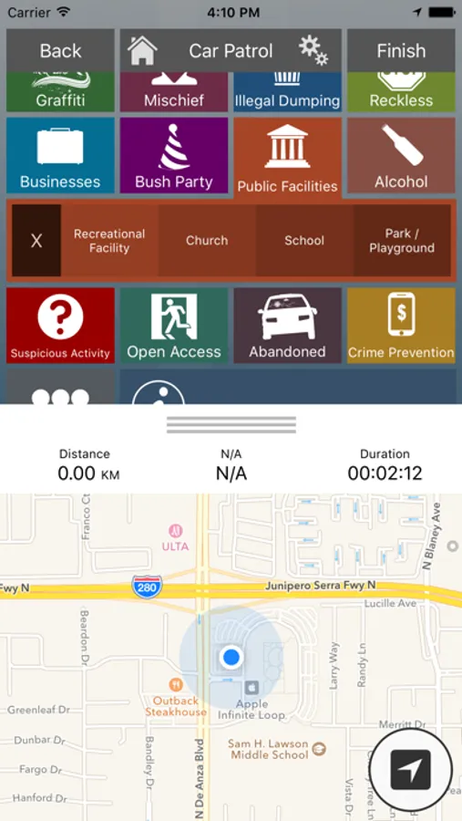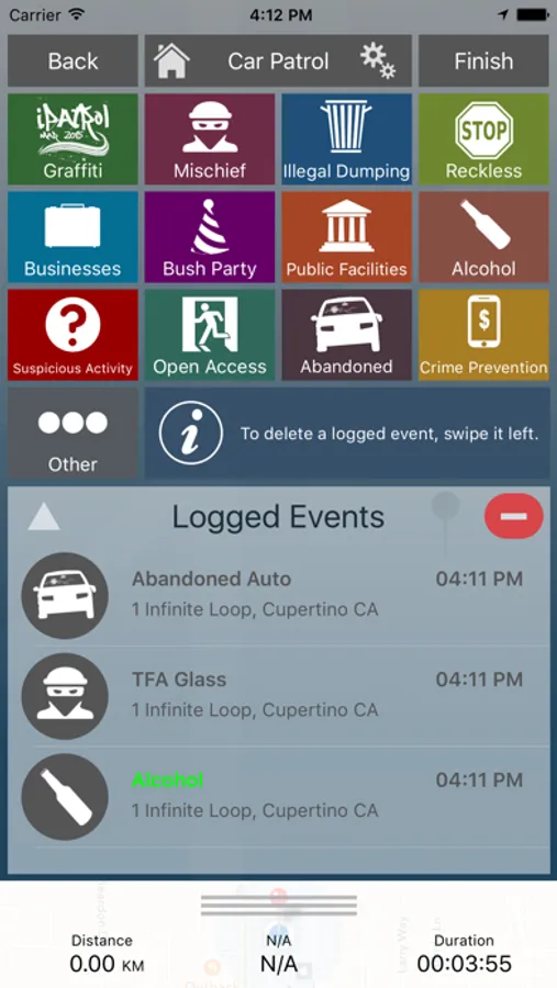 Users can document community interactions, patrol routes, and various activities. The location of many different types of incidences will be recorded and summarized into a report (consisting of both a PDF and an Excel document). The report can then be emailed to a designated department or specific individuals to advise them of the documented issues.