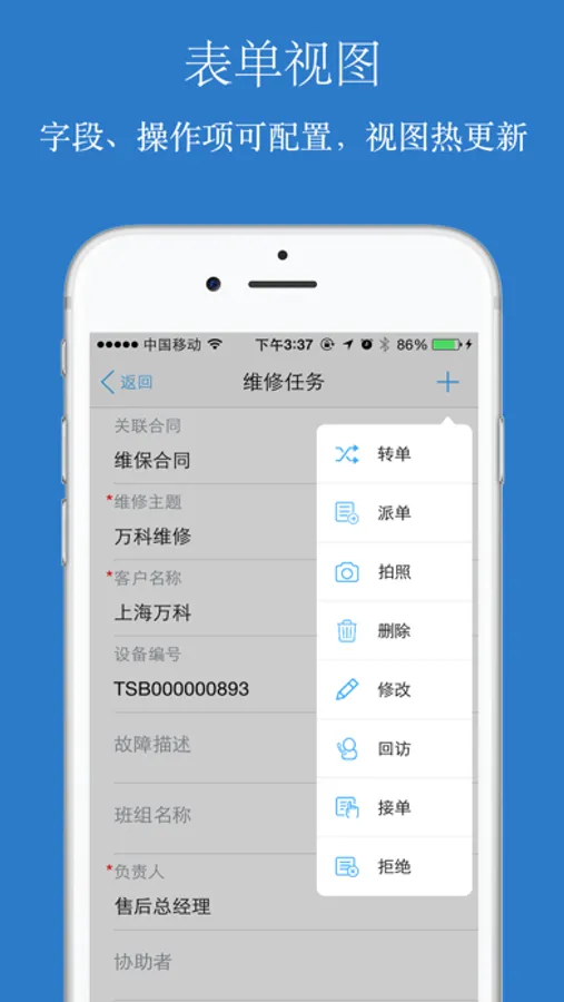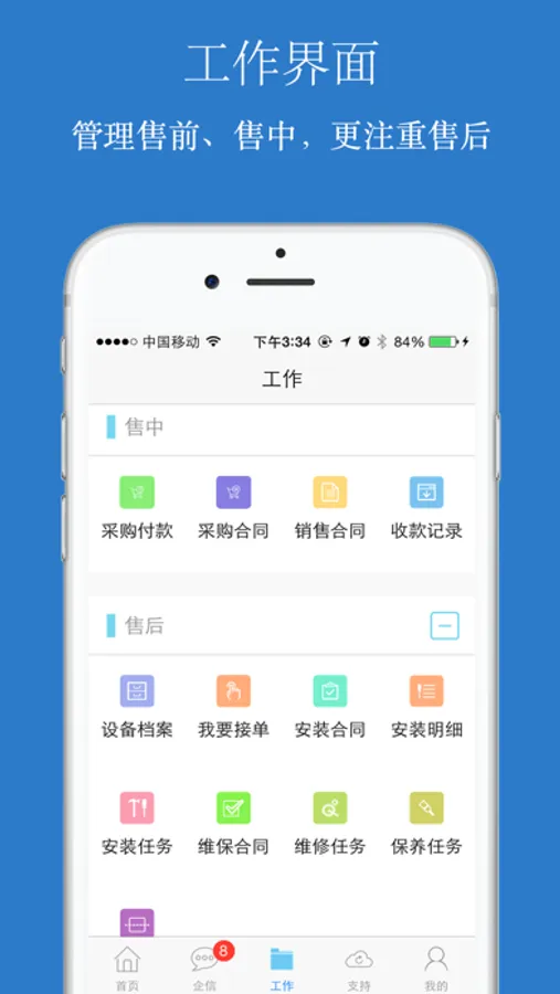2)可实现设备售后服务管理,包括安装、维修、保养的任务管理,现场签到、拍照等管控;