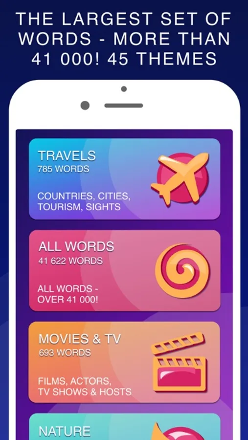 Start set, Kids, Mix set, Act it out, Animals, All words, Easy words, Brainstorm, Family, Celebrities, Movies and TV, Cartoons, Travel, Meal and food, Sport, Literature, Art, Music, Science, Phrases, Trends, Brands, Nature, House, Professions, School, Hobbies, Act it out - Hard, Celebrities - Hard, Movies & TV - Hard, Literature - Hard, Music - Hard, Sport - Hard, Art - Hard, Science - Hard, Travel - Hard, Transport, Inventions, Technology, Men, Women, Person, Summertime, New Year, Clothes