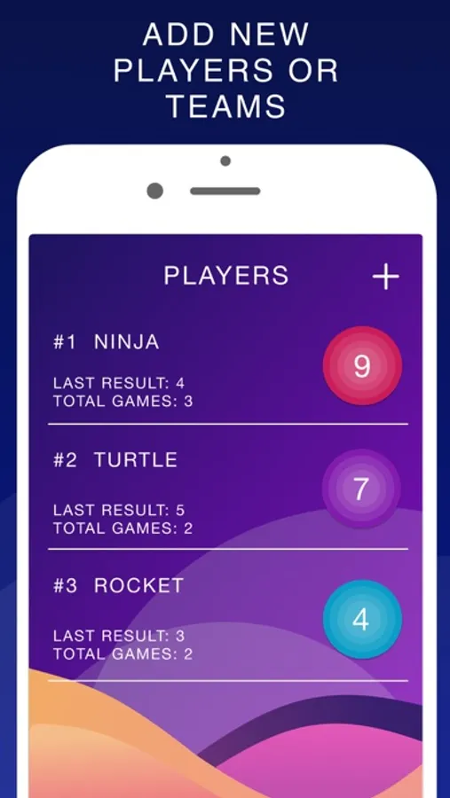 You can add new players. Last result, total score and games are shown for each player. Click on a player's name to change it – from 1 to 14 symbols.
