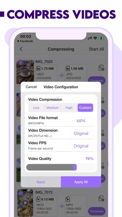 The perfect solution for anyone looking to reduce the size of their video files without sacrificing quality. With our app, you can easily compress your videos and optimize them for seamless playback on any device. Say goodbye to large, slow-loading videos and hello to lightning fast, high-quality videos that are easy to share and store.