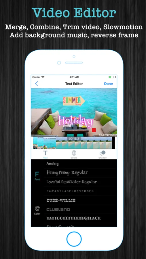 • Text: Type your text with color, various fonts, and effects with time constraint
