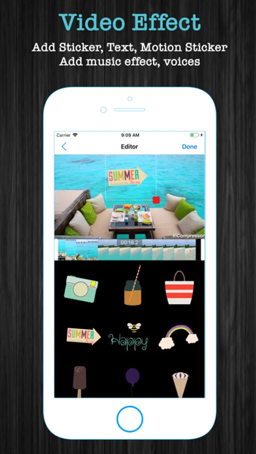 • Stickers: add emojis and stickers to your video with time constraint