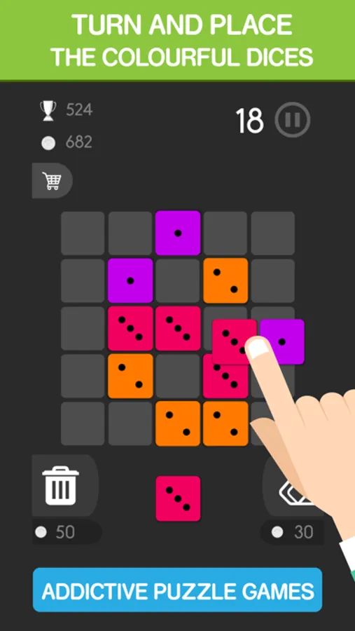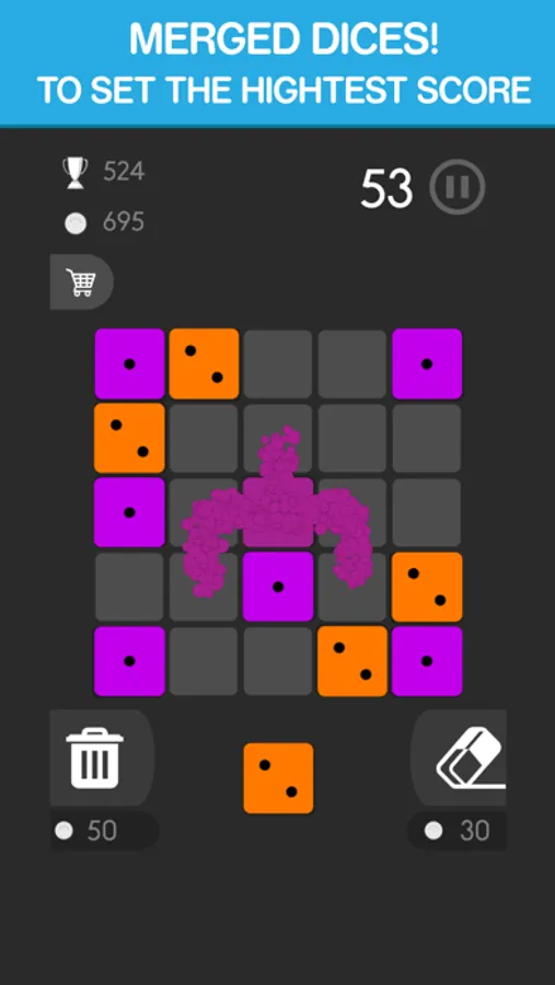 Place three dices with the same number & color next to each other to merge them, horizontally, vertically, or both. You can rotate dices before placing them too!