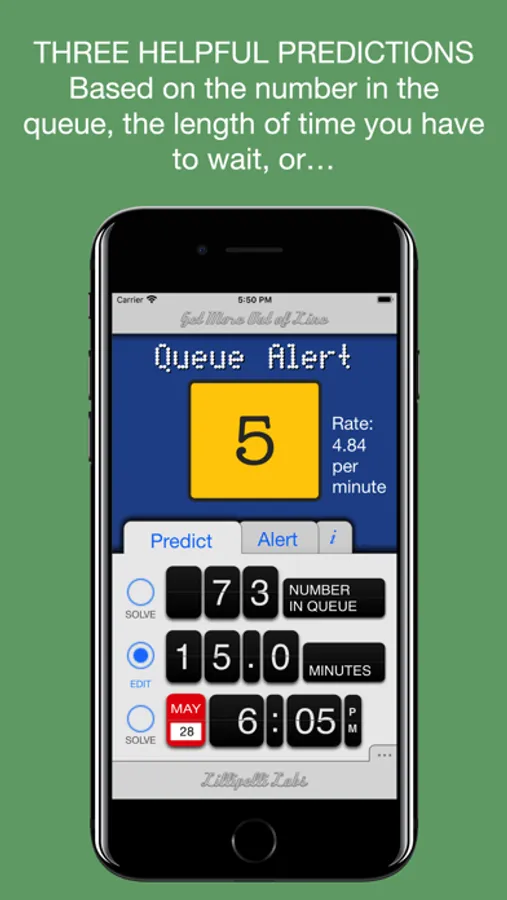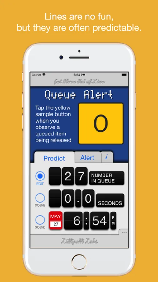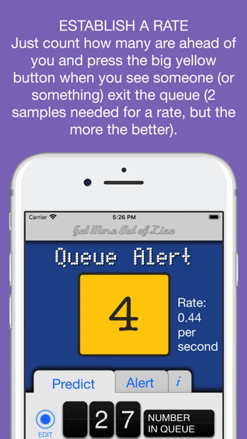 Queue Alert isn't just for waiting in lines! This app could be used to help predict the movement of anything through a queuing system of any sort. Really, it's just math. Tap the "number in queue" flipper to cycle through a number of possible options and fully customize your experience.