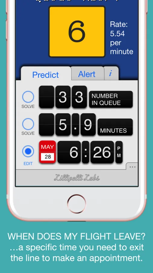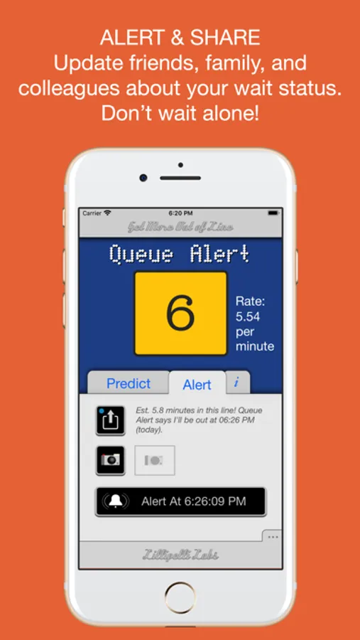 Queue Alert can help, doing the math for you and giving you live estimates that you can use. Once a rate is established, you can predict your wait time or predict how many people or items will get through the queue by a given time. Or, you can enter the amount of time you have to wait to see how far the queue will progress. All of this is easily at your fingertips.