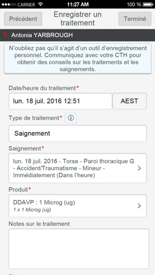 MonRCTC est une application sécurisée pour les personnes souffrant d’un troubles de la coagulation ou les parents/tuteurs au Canada pour enregistrer les traitements à domicile.