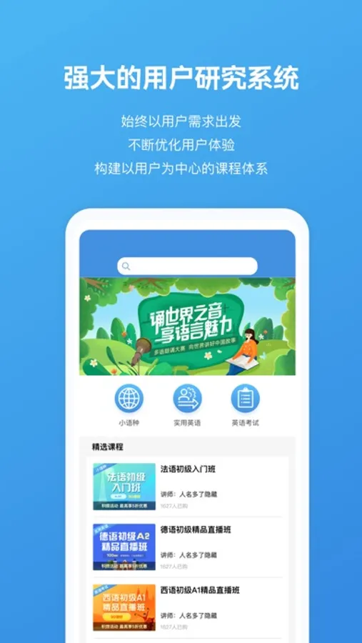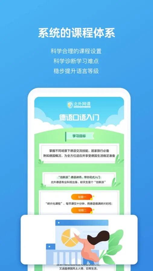 “北外网课”依托北京外国语大学和外研社的师资力量与教学资源,致力于为高校、机构、企业和广大语言学习用户提供具有专业、互动和智能化的在线学习解决方案。课程覆盖英、日、韩、法、德、俄、西等二十种语言,为国内考试、出国留学、英语能力提升、多语学习、青少英语等各类需求提供在线教育服务。
