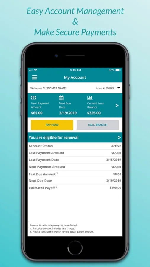 Make account management easier than ever with the Security Finance℠ Mobile App. Easily make a secure payment, check your next due date, call your local branch, and so much more — all right within the app! Plus, receive notification reminders so that you never have to worry about making a late payment.