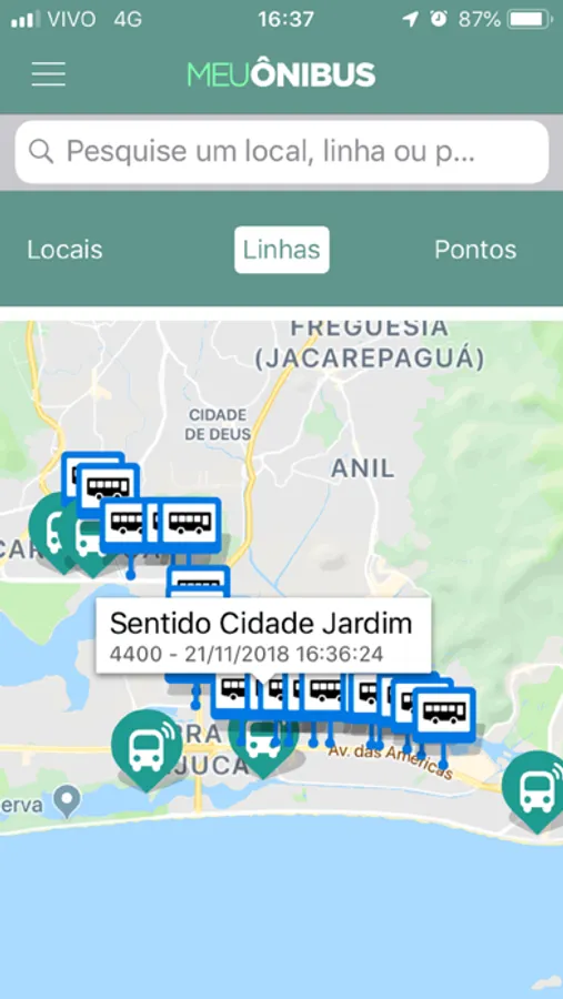 · Selecione o ponto de parada desejado e visualize as linhas que passam por este ponto e suas respectivas previsões de chegada;