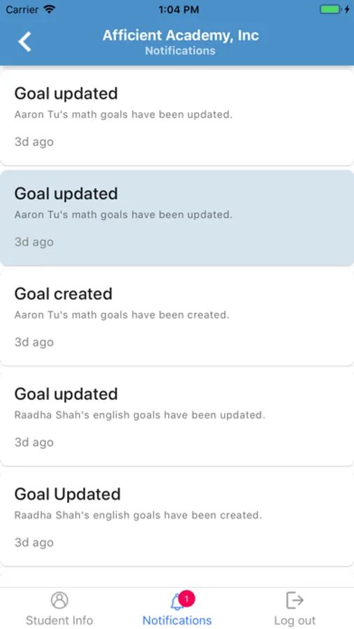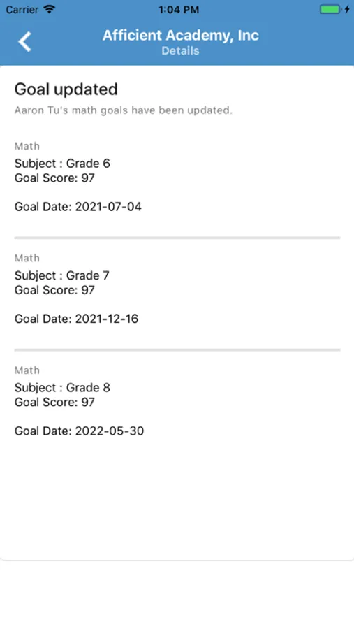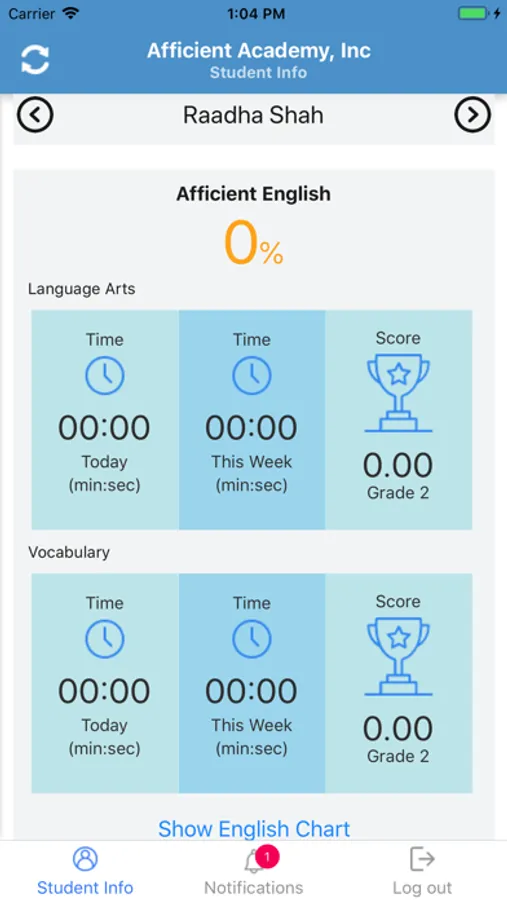 View real-time updates of student’s progress on Afficient Math and Afficient English.