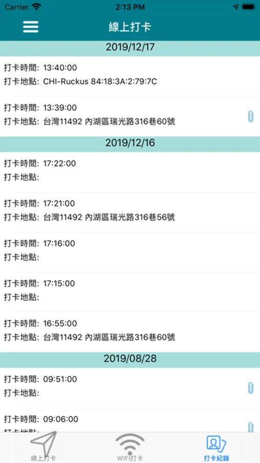 打卡紀錄:查詢個人每天打卡時間及地點紀錄。