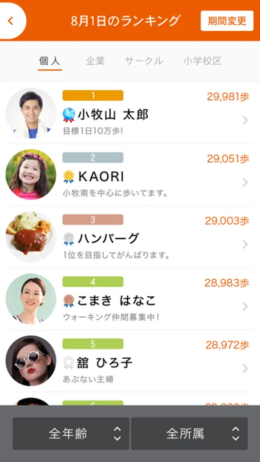 個人、企業、サークル、小学校区別に、歩数ランキングを確認できます。