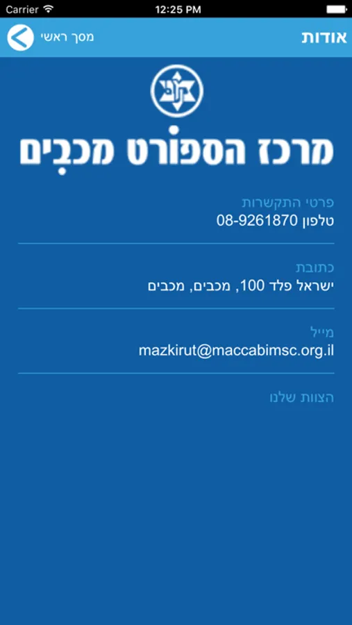 אפליקציית מרכז ספור מכבים מאפשרת לחברי המועדון לצפות בפרטי המנוי, לצפות ולהירשם למערכת שיעורי הסטודיו , עדכוני הדקה ה-90 ותזכורות ביומן האישי, פנייה ישירה למשרדי המועדון, להתעדכן בחדשות ומבצעים מיוחדים, ועוד