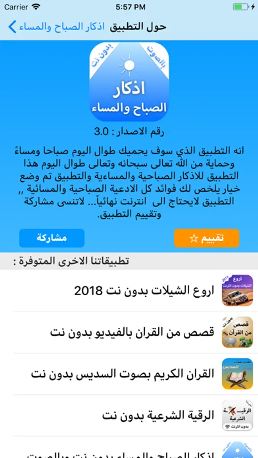 انه التطبيق الذي سوف يحميك طوال اليوم صباحا ومساءً وحماية من الله تعالى سبحانه وتعالى طوال اليوم هذا التطبيق للاذكار الصباحية والمساءية والتطبيق تم وضع خيار يلخص لك فوائد كل الادعية الصباحية والمسائية, وامكانية قراءة القران الكريم ,, التطبيق لايحتاج الى انترنت نهائياً