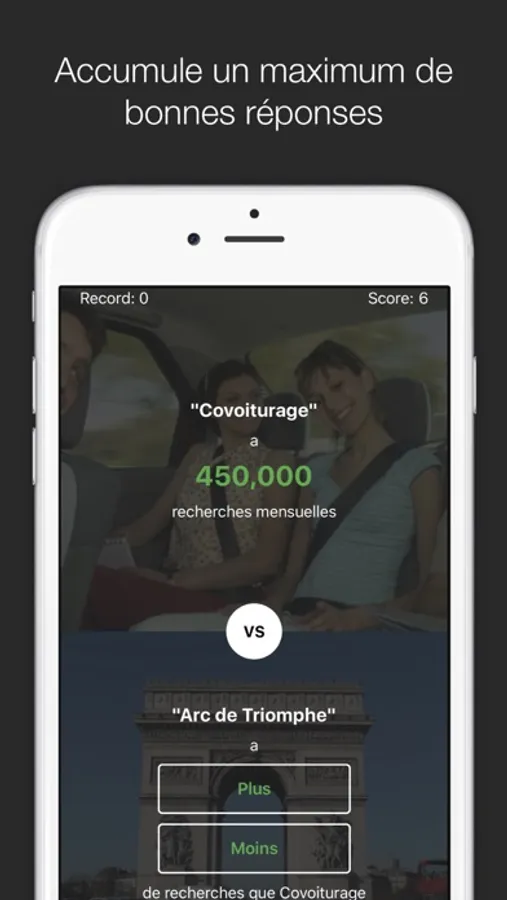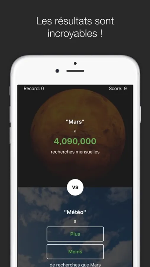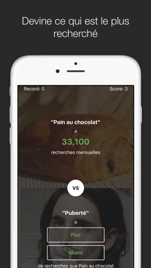 Ce jeu est très simple, drôle et même addictif voire rageant pour certains ! Il te suffit de choisir quel terme est le plus recherché sur Google. Pour cela il faut sélectionner « Plus » ou « Moins ». Le but est d’enchainer un maximum de bonne réponse pour décrocher la meilleure place dans le classement.