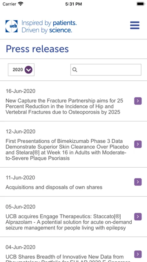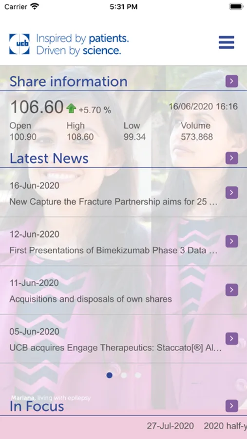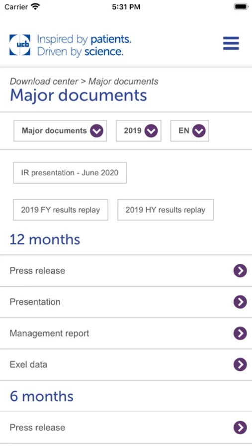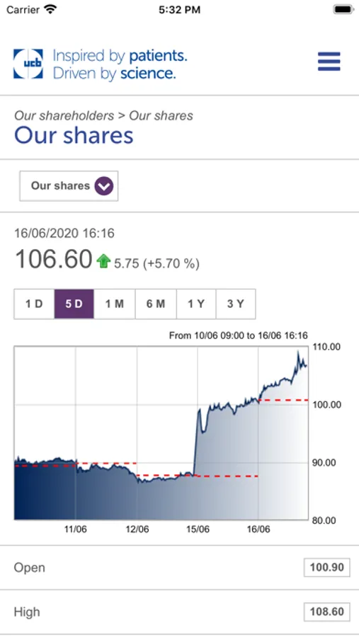 UCB IR App gives you easy access to the latest financial information on UCB when you are on the move, in a format optimized for smartphones and tablets and aimed for all shareholders and investors. The App financial contents, namely share price information, financial news, publications (annual reports, code of conduct, financial presentations, press releases, documents for the annual general meeting, stories, webcasts and conference calls), company information, etc., are continuously synchronized with the latest information available on the Investor Relations section of www.ucb.com.