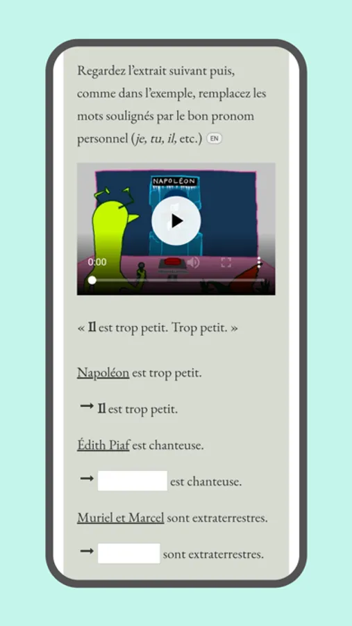 Un contenu personnalisé : Chaque jour, recevez une leçon adaptée à vos besoins et votre niveau : contenus écrit, audio et vidéo, accents variés, français moderne... 15 minute par jour seulement !