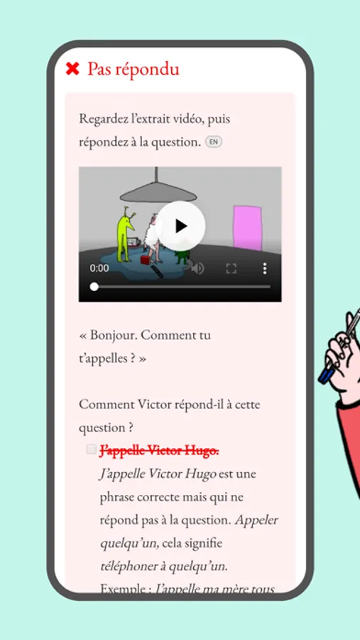 Une correction immédiate : Après avoir répondu aux questions, vous recevez votre correction avec votre score, des remarques personnalisées, le vocabulaire demandé, etc.