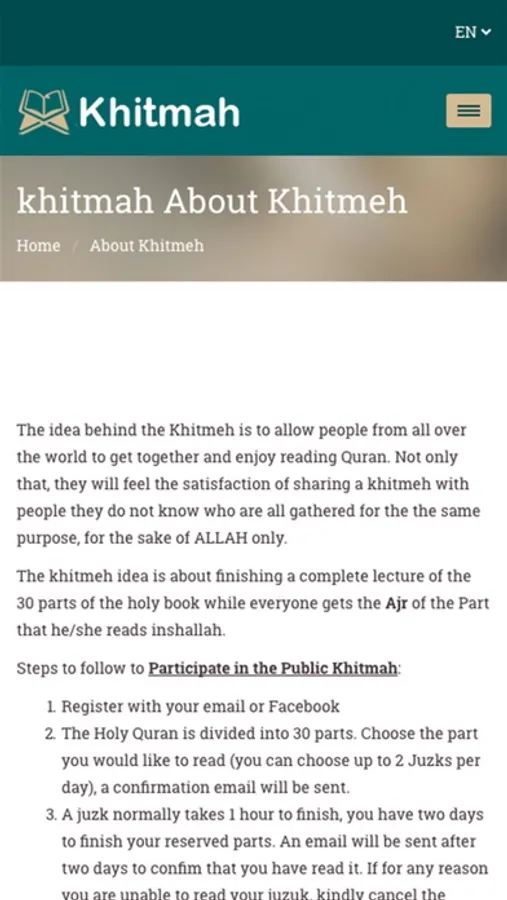 The idea behind the Khitmeh is to allow people from all over the world to get together and enjoy reading Quran. Not only that, they will feel the satisfaction of sharing a khitmeh with people they do not know who are all gathered for the the same purpose, for the sake of ALLAH only.