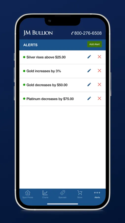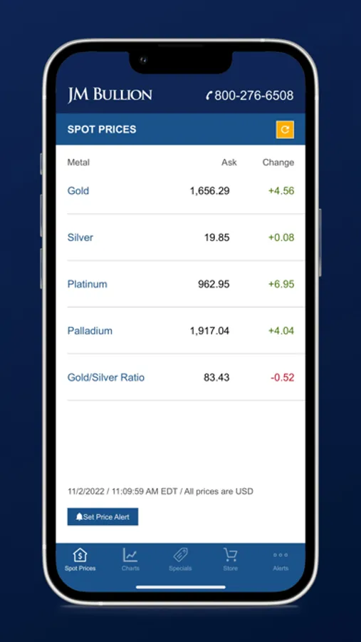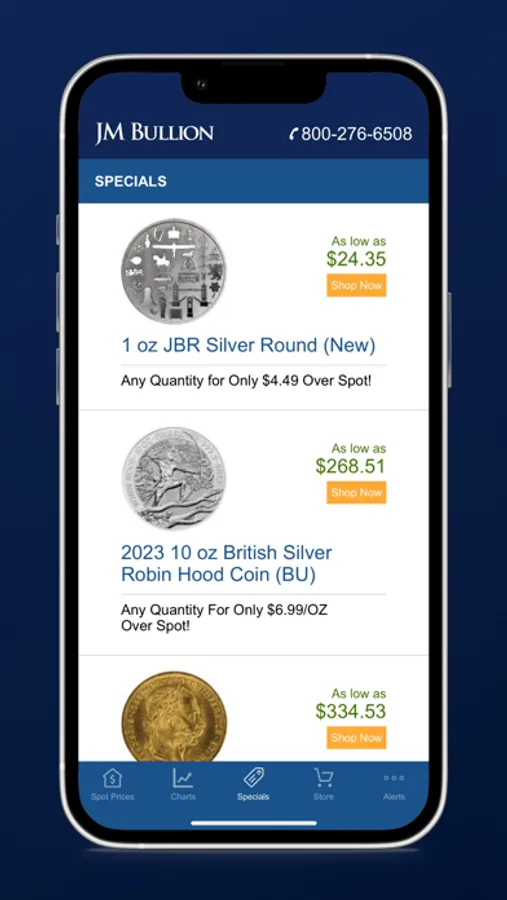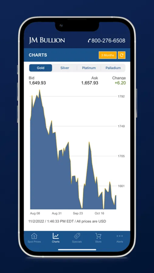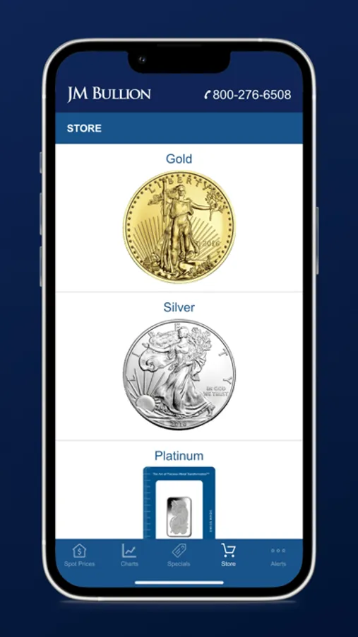 JM Bullion, the leading online bullion dealer in the United States, brings a premium precious metals app to the iPhone. Stay on top of the market by watching live spot price movements of gold, silver, platinum, and palladium. Keep up with past trends in those precious metals’ prices by studying our interactive charts. Know when the time is right for you to invest by creating customizable email and text alerts for when the gold price or silver price reaches set values specified by you. Be sure you are spending your money wisely by checking out the items JM Bullion has on sale at any given moment. Quickly access our full catalogue of gold, silver, copper, platinum, and palladium products on the JM Bullion mobile site by visiting the app’s store.