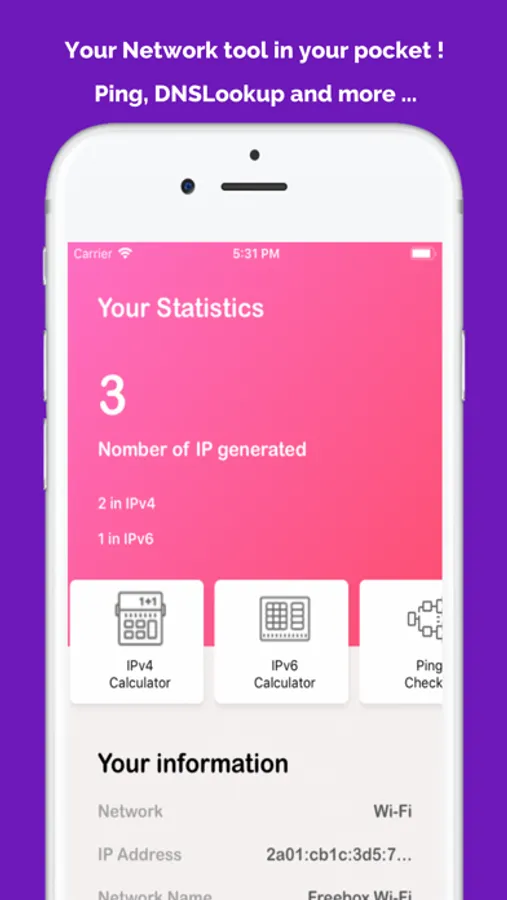 But that's not all ! A network administrator is not confined only to calculate IP address, so you can find within the application ping checker to check network latency (and also check if a site is online or not), and that a domain name resolver to display the IP address of the server!