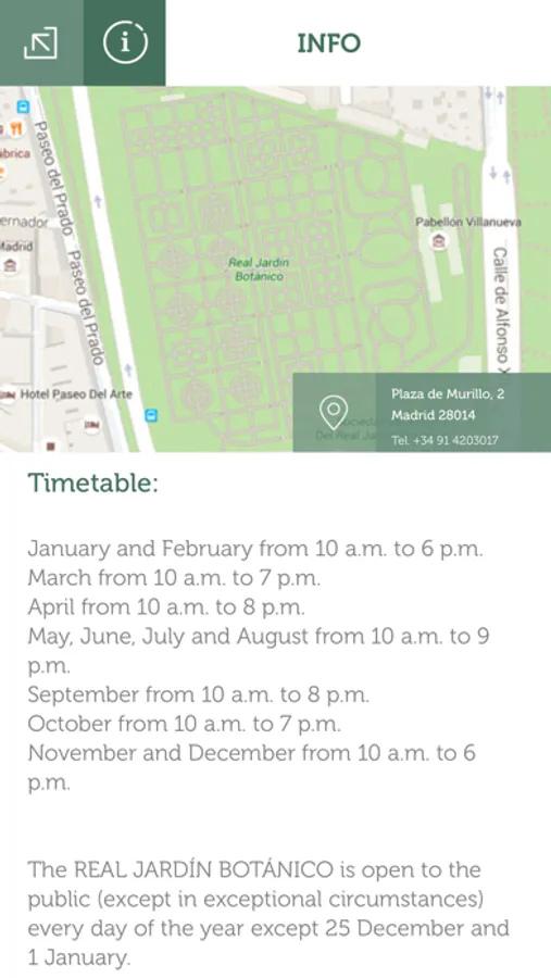 The app. includes an audioguide with a description of the plants and the major attractions of the Garden, plus several guided Tours that will provide you with an interesting perspective, including a childrens’ tour and a visit of Don Quixote's plants.