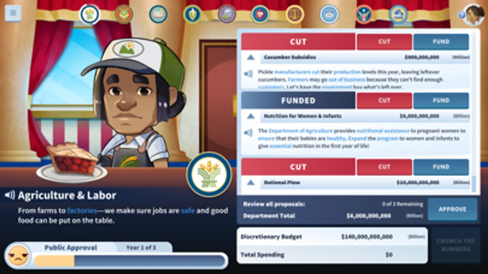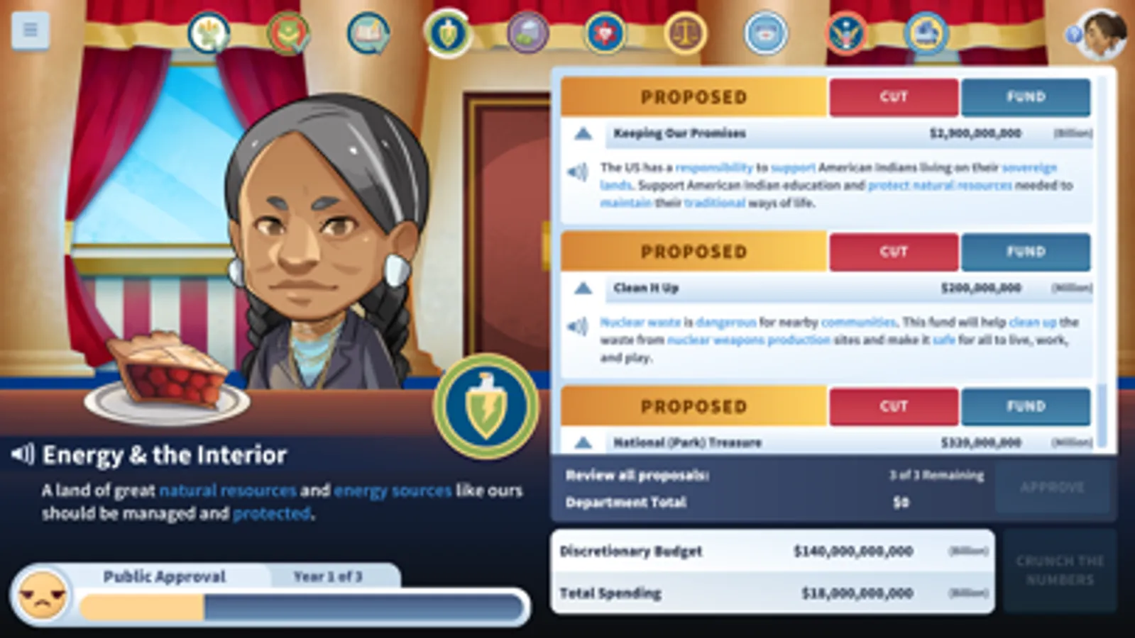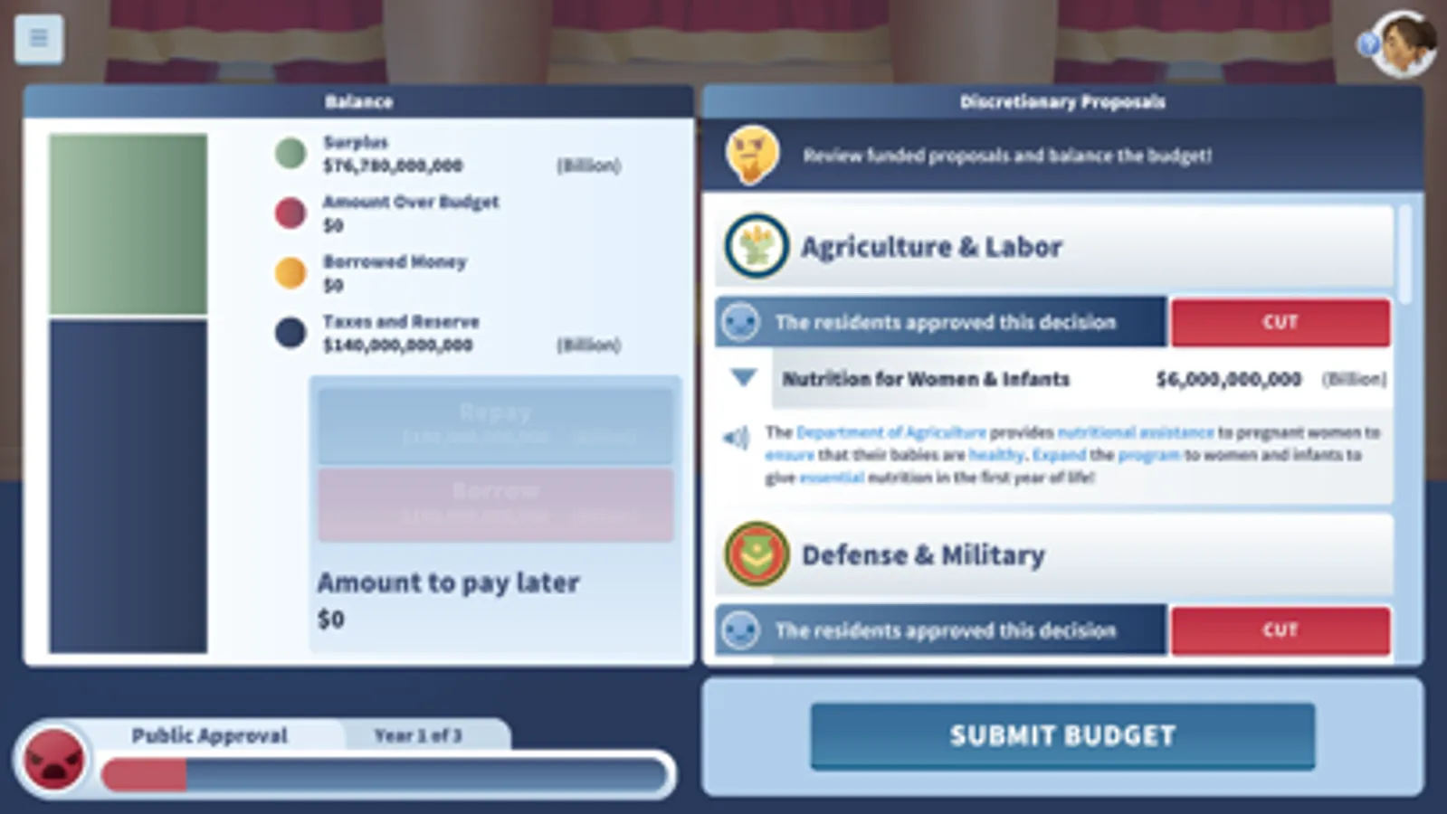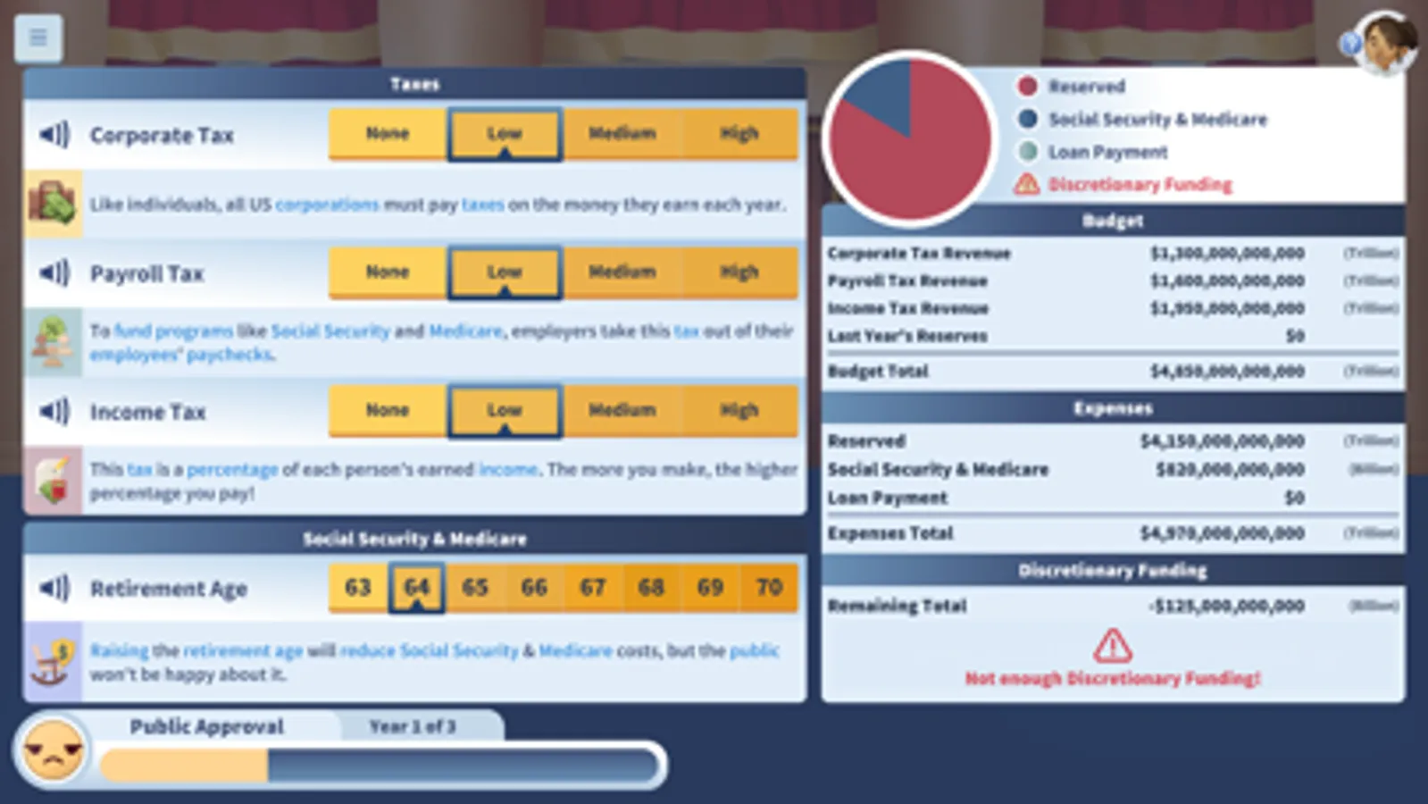 People's Pie is a balancing act! You must fund important programs without setting tax rates too high or borrowing too much money. To succeed, you