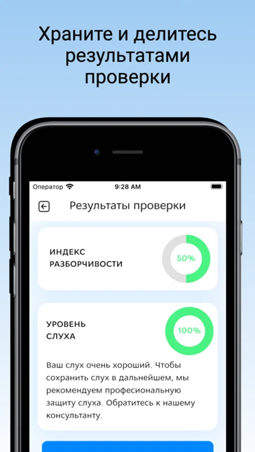 - Возможность настроить слуховой аппарат под себя используя результаты (приложение рекомендует вам режим работы аппарата);