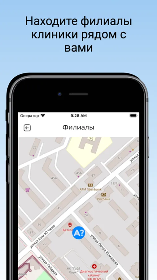 - Возможность посмотреть местоположение клиник Аудионика по карте;