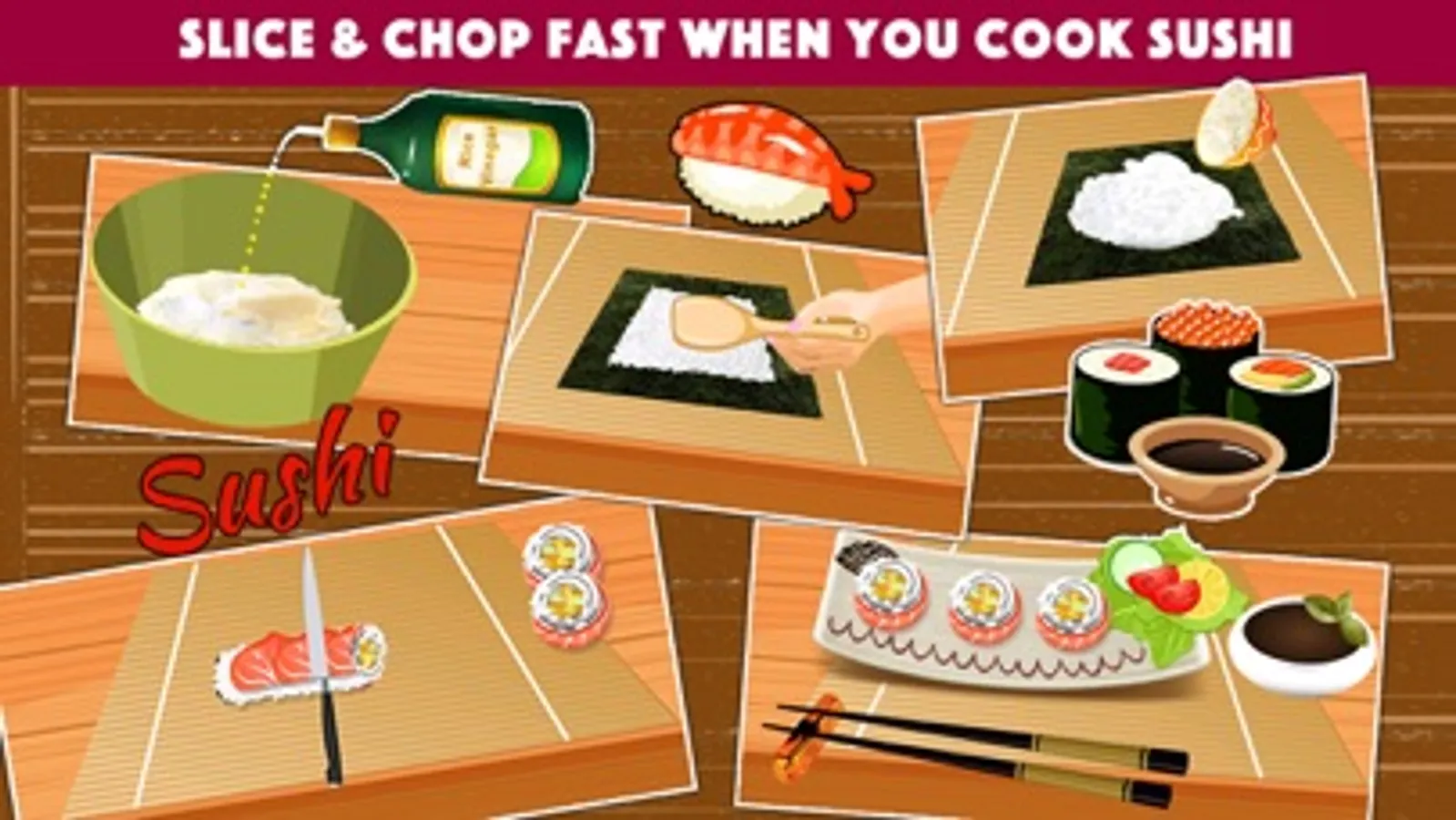 Get ready to slice and chop fast when you cook sushi. Add sushi ingredients on a seaweed sheet, roll it and show your sushi maker skills!